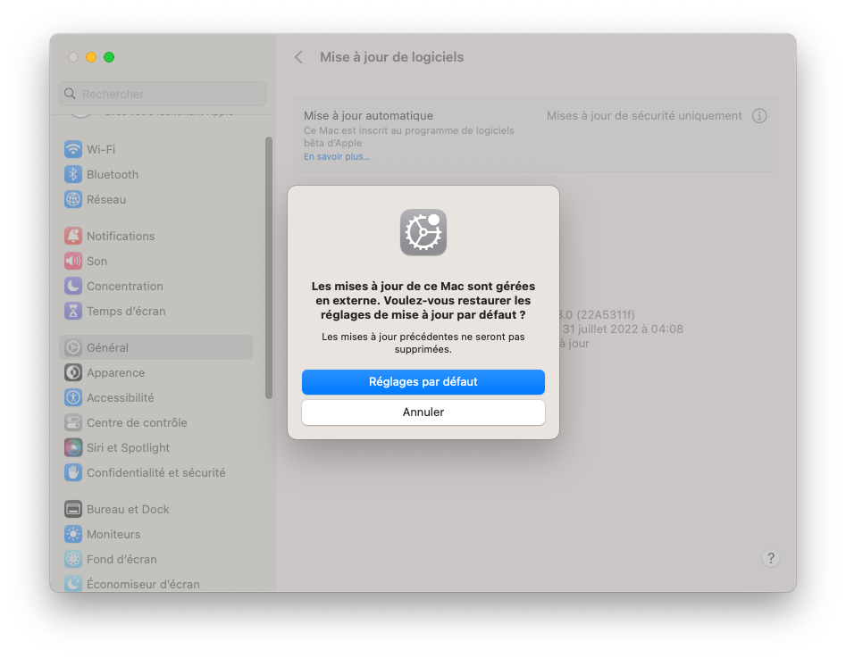 • attendez la prochaine mise à jour finale de macOS Monterey et retournez  > Réglages du système > Général > Mise à jour de logiciels.