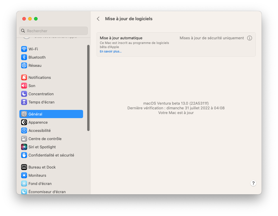 Normalement, contrairement au profil iOS 16 bêta, vous n’avez pas besoin de redémarrer le Mac pour voir les mises à jour de macOS Ventura bêta.