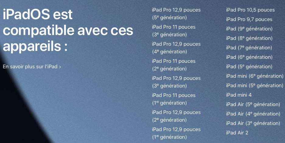 Voici une liste plus exhaustive de tous les iPad compatibles avec iPadOS 15 :