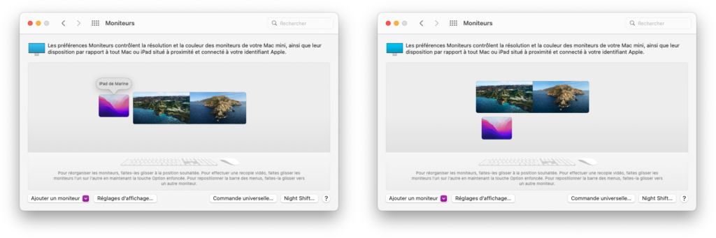 Vous devez voir l’écran (ou les écrans) de votre Mac principal mais également l’écran de votre iPad ou Mac avec qui vous allez utiliser Commande universelle. À l’aide de glisser-déposer, vous pouvez positionner chaque écran à l’emplacement souhaité. À la manière d’un écran supplémentaire classique pour votre Mac. Pour que ce soit plus intuitif, positionnez-le par rapport à votre Mac et sa position réelle. Cela vous évitera une certaine gymnastique de cerveau mais ne vous en sentez pas obligé.